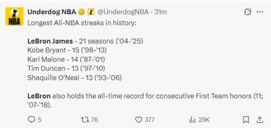 3.詹姆斯21次最佳陣容是歷史最長,鄧肯、科比、賈巴爾15次排在第二;