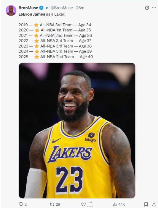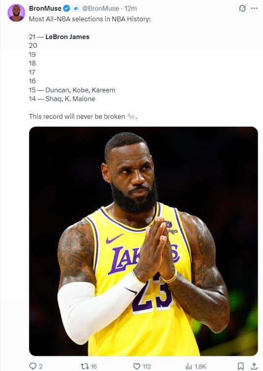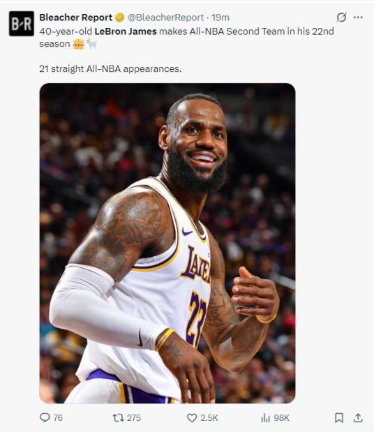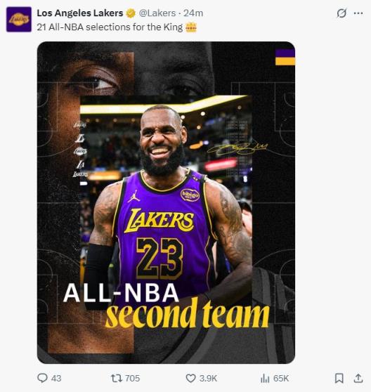 換言之40歲高齡的勒布朗-詹姆斯職業(yè)生涯第21次入選最佳陣容,湖人官方為King祝賀。