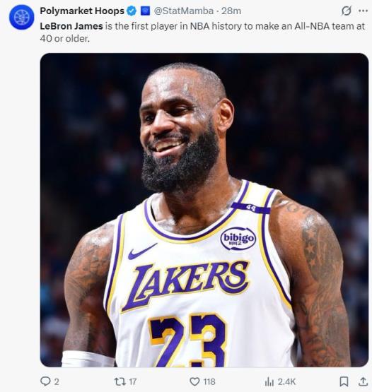 4.勒布朗是NBA歷史上首位40歲或以上入選最佳陣容的球員;