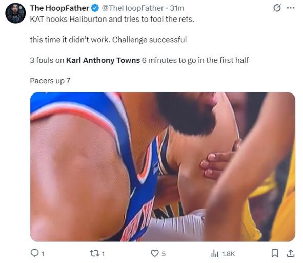 整個上半場唐斯都沒有什么存在感,最大的一個點就是拉拽哈利伯頓被卡萊爾挑戰(zhàn),這個球唐斯很明顯是故意拉哈利伯頓的胳膊,裁判看回放后給了唐斯第三次犯規(guī),唐斯整個上半場7中2拿4分6籃板。