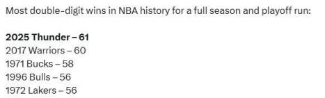 這是雷霆本賽季第61場(chǎng)凈勝分兩位數(shù)的勝利,超過(guò)2017年勇士的60場(chǎng),刷新歷史紀(jì)錄。