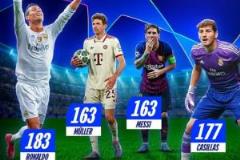 穆勒在歐冠的出場數(shù)排名賽事歷史并列第三位,僅少于C羅(183)、卡西(177)。在此前162場歐冠比賽中,穆勒打進57球,助攻34次。
