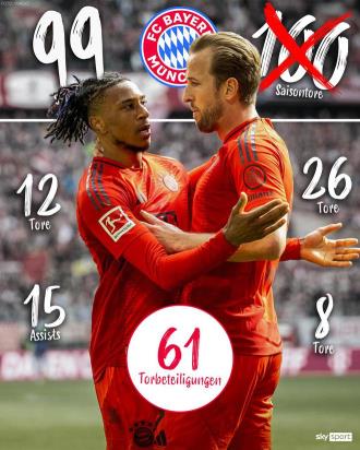 拜仁僅以一球之差無緣賽季百球大關(guān)!本賽季德甲助攻王奧利塞與聯(lián)賽金靴凱恩兩人直接參與61粒進球。