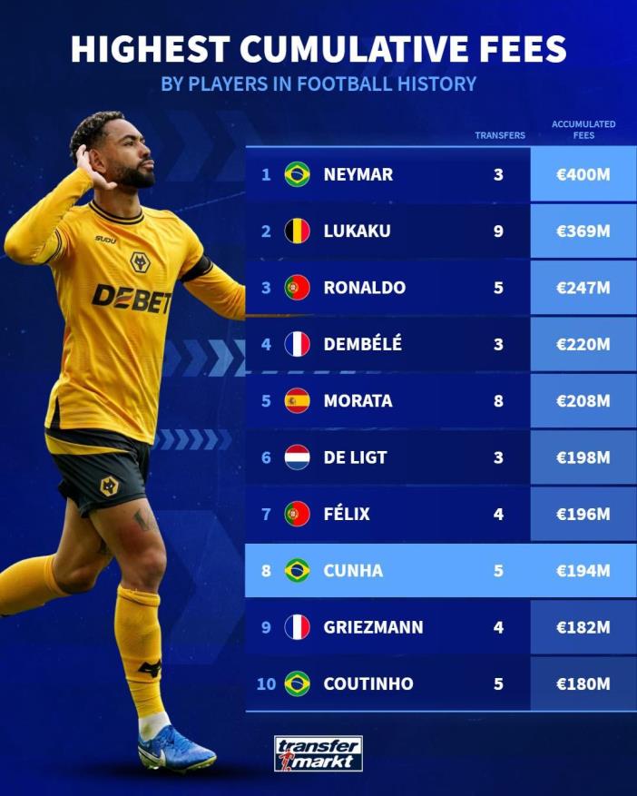 曼聯(lián)官方宣布與狼隊(duì)就馬特烏斯-庫尼亞轉(zhuǎn)會(huì)達(dá)成協(xié)議,據(jù)悉轉(zhuǎn)會(huì)費(fèi)為7400萬歐。據(jù)德國轉(zhuǎn)會(huì)市場(chǎng)網(wǎng)站統(tǒng)計(jì),庫尼亞職業(yè)生涯累計(jì)轉(zhuǎn)會(huì)費(fèi)已達(dá)到1.94億歐,為歷史第八多。