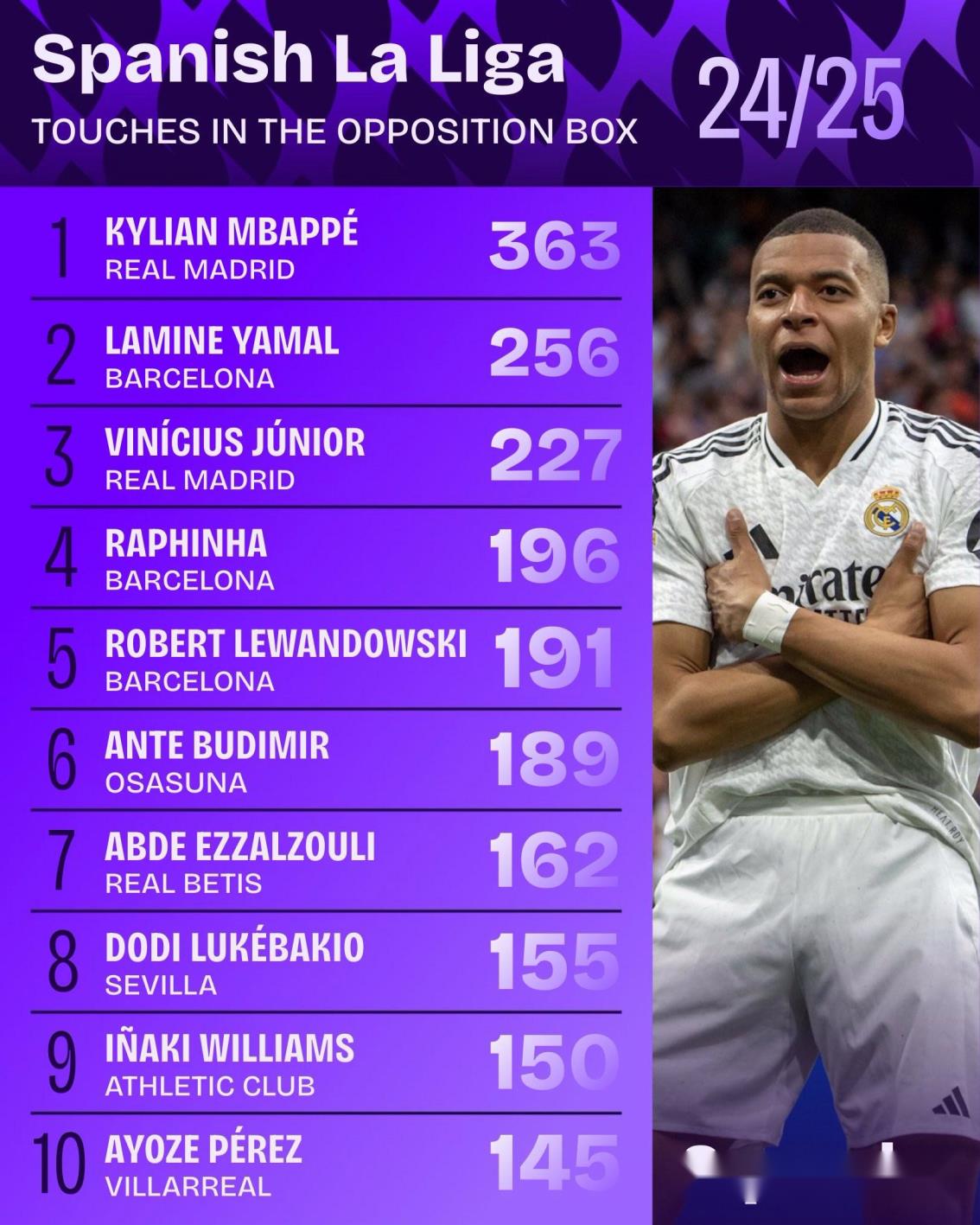 據(jù)統(tǒng)計,皇家馬德里的姆巴佩是本賽季西甲聯(lián)賽在對方禁區(qū)內(nèi)觸球次數(shù)最多的球員。