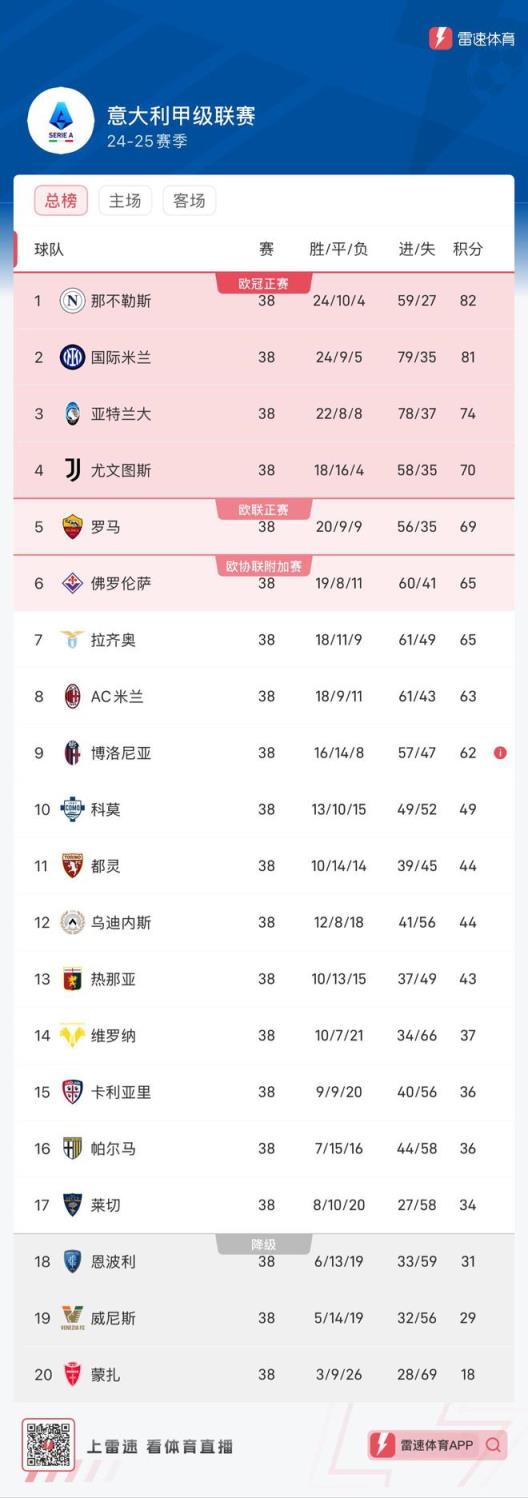 雷速體育5月26日訊 24/25賽季意甲聯(lián)賽最后一輪比賽結束,各種懸念隨之揭曉。在最受關注的歐冠資格爭奪中,尤文最終有驚無險3-2擊敗威尼斯保四成功,而降級懸念方面最終恩波利不敵對手遭遇降級。