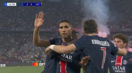 第12分鐘,巴黎前場傳遞打穿了國米防線,維蒂尼亞送出直塞球,埃杜再分球,助攻阿什拉夫推射入網(wǎng),攻破舊主大門后拒絕慶祝,巴黎1-0取得夢幻開局。