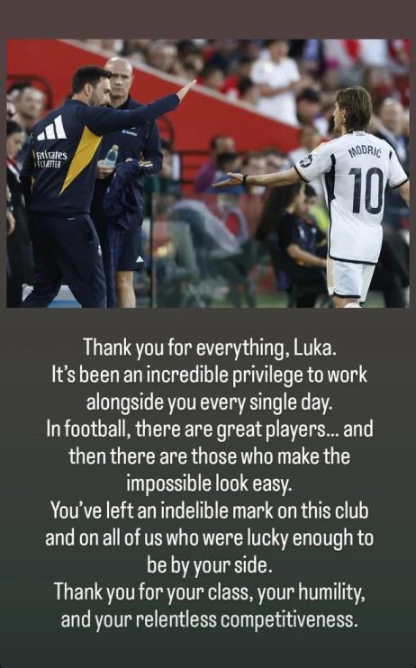 達(dá)維德-安切洛蒂表示:“謝謝你所做的一切,莫德里奇。能在這里每天與你一起工作是莫大的榮幸。在足球領(lǐng)域,有偉大的球員,也有讓不可能的事情看起來非常容易的球員。你為這家俱樂部留下了不可磨滅的印記,也在我們每個(gè)人身上留下了印記,我們非常幸運(yùn)能在你身邊。謝謝你的指導(dǎo),你的謙遜,以及你無休止的努力?!?/p>