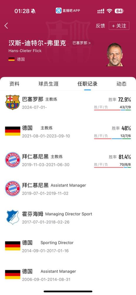 本賽季,弗里克執(zhí)教巴薩贏得西甲、國(guó)王杯和西班牙超級(jí)杯三座國(guó)內(nèi)冠軍,歐冠闖入四強(qiáng),截至目前帶隊(duì)59場(chǎng)比賽,戰(zhàn)績(jī)43勝7平9負(fù)。