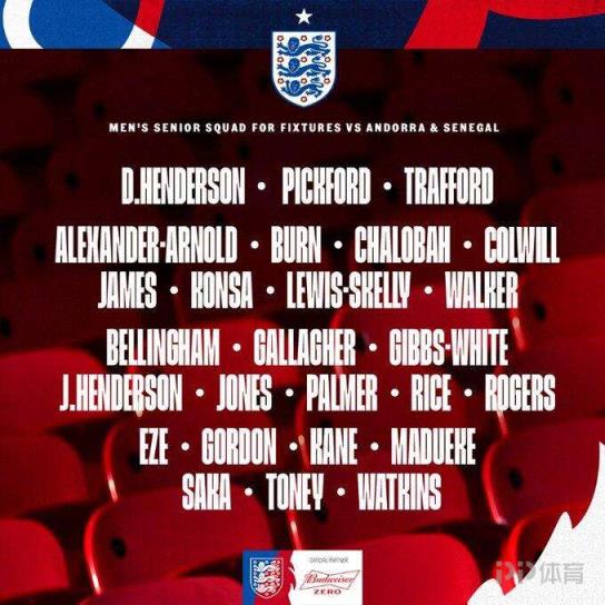 英格蘭隊今日公布最新一期大名單,在即將到來的國際比賽日中,英格蘭將對陣安道爾和塞內(nèi)加爾。