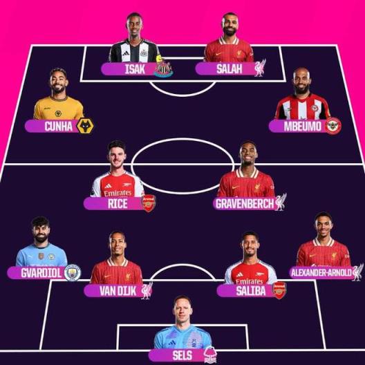 2024-25賽季英超落幕,知名足球數(shù)據(jù)機(jī)構(gòu)Opta評(píng)選了本賽季英超最佳陣容,薩拉赫領(lǐng)銜,阿諾德、賴(lài)斯、伊薩克等人在列。