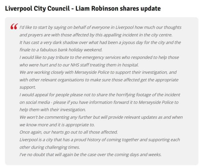 當(dāng)?shù)貢r(shí)間5月26日,在利物浦進(jìn)行奪冠游行時(shí),一輛汽車(chē)在沃特街與戴爾街附近沖入了慶祝的人群。這一事件后,利物浦市議會(huì)的Liam Robinson發(fā)表了聲明。