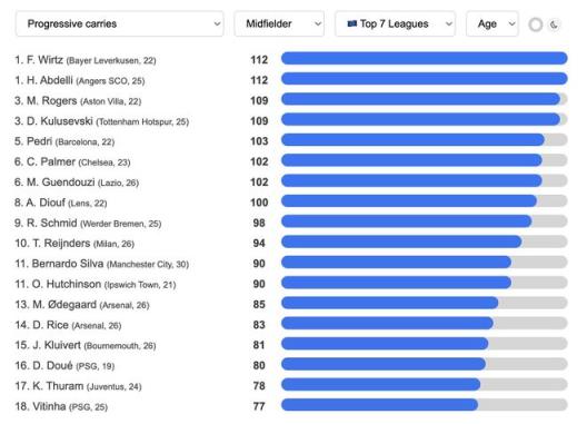 北京時間5月27日,足球?qū)I(yè)數(shù)據(jù)平臺DataMB公布了本賽季歐洲七大聯(lián)賽中持球推進(jìn)次數(shù)最多的球員前20名,勒沃庫森中場球星維爾茨以112次持球推進(jìn)次數(shù)與昂熱球星希馬德-阿卜杜利并列第一。