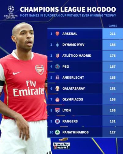 德轉(zhuǎn)統(tǒng)計參加歐冠比賽卻未奪冠的俱樂部中,阿森納211場仍未奪冠排名第一,而即將要沖擊首冠的巴黎,以167場仍未奪冠排名第4。