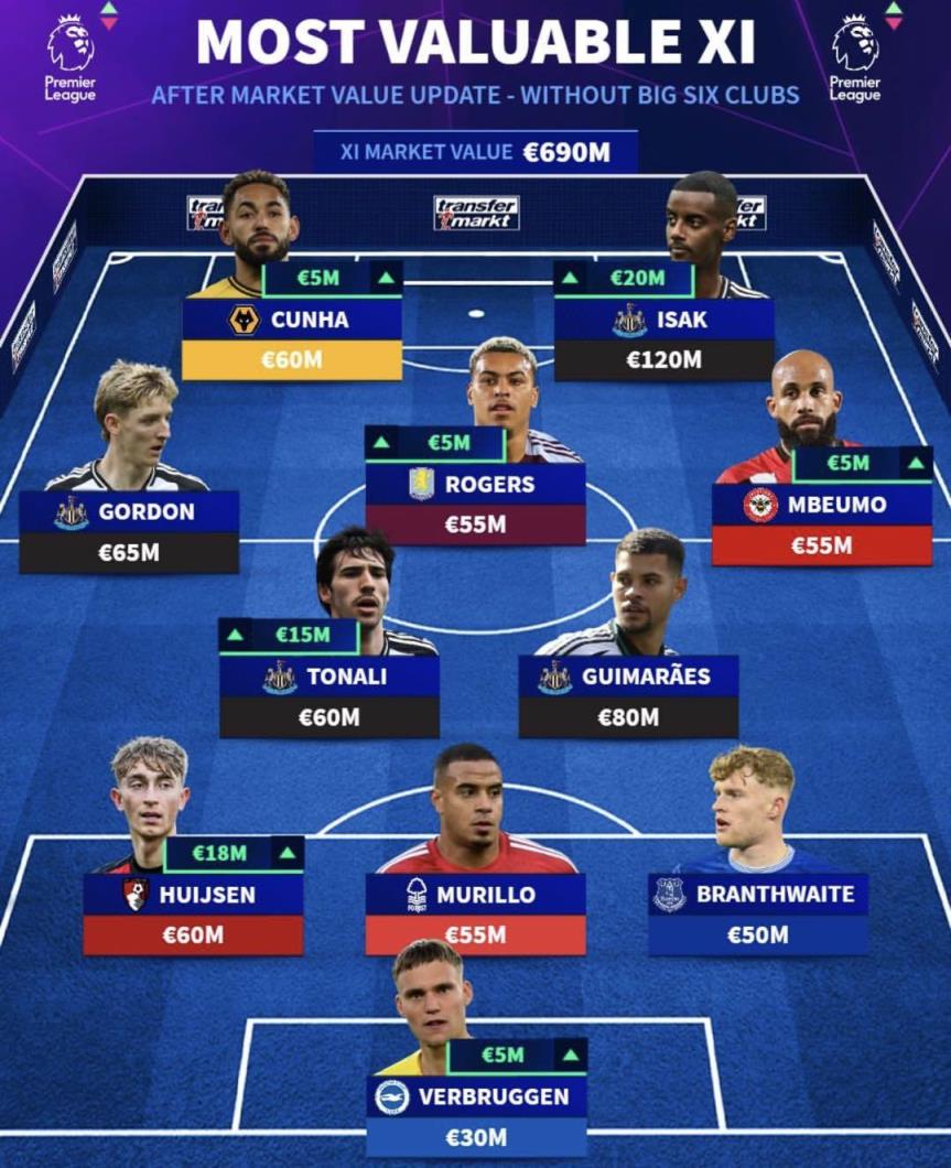 前鋒:戈登(紐卡斯爾聯(lián),6500萬歐元)、庫尼亞(狼隊,6000萬歐元)、伊薩克(紐卡斯爾聯(lián),1.2億歐元)、姆貝烏莫(布倫特福德,5500萬歐元)