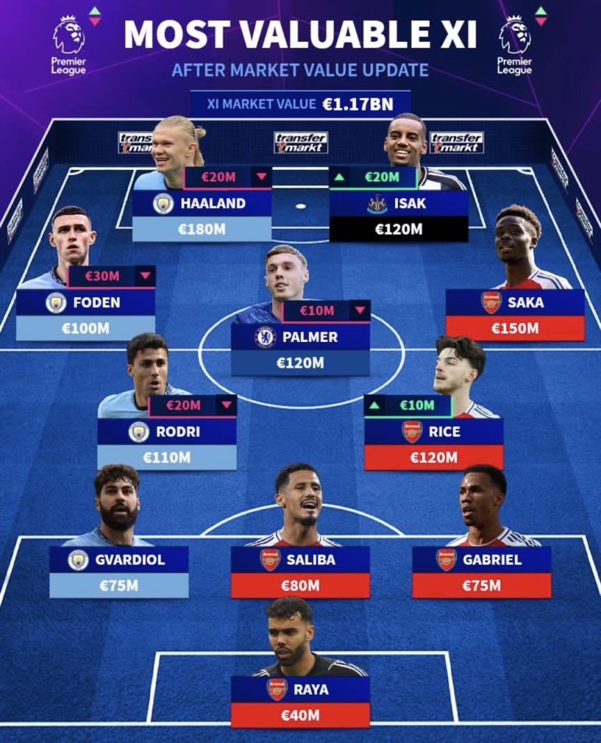 北京時間6月1日,德國轉(zhuǎn)會市場網(wǎng)站列出了英超最貴11人陣容和除BIG6外的最貴11人陣容,阿森納5人、曼城4人入選。