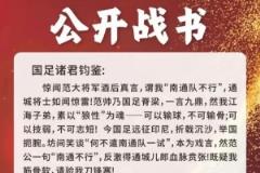 7日,網(wǎng)上出現(xiàn)了一篇名為《南通草根足球隊(duì)致中國(guó)國(guó)家男子足球隊(duì)公開(kāi)戰(zhàn)書(shū)》的文章,文章稱(chēng):“驚聞范大將軍酒后真言,謂我‘南通隊(duì)不行’,通城將士如聞驚雷!”隨后文章以“南通草根足球隊(duì)”的名義向國(guó)足下戰(zhàn)帖,要求約定時(shí)間地點(diǎn)、規(guī)則尺度等。文章表示,若南通隊(duì)敗,全隊(duì)登報(bào)敬告天下:“范帥慧眼,吾輩確遜國(guó)足!”若國(guó)足負(fù),只求諸君一句:“南通,可戰(zhàn)!”